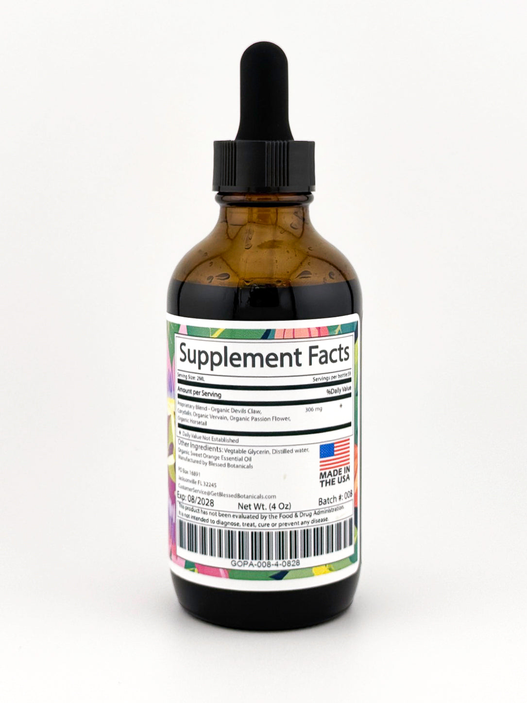Ingredients: Wildcrafted Vervain, Wildcrafted Devils Claw, Wildcrafted Horsetail, Organic Passion Flower, Corydalis, Organic Sweet Orange, Distilled Water, Vegetable Glycerin
